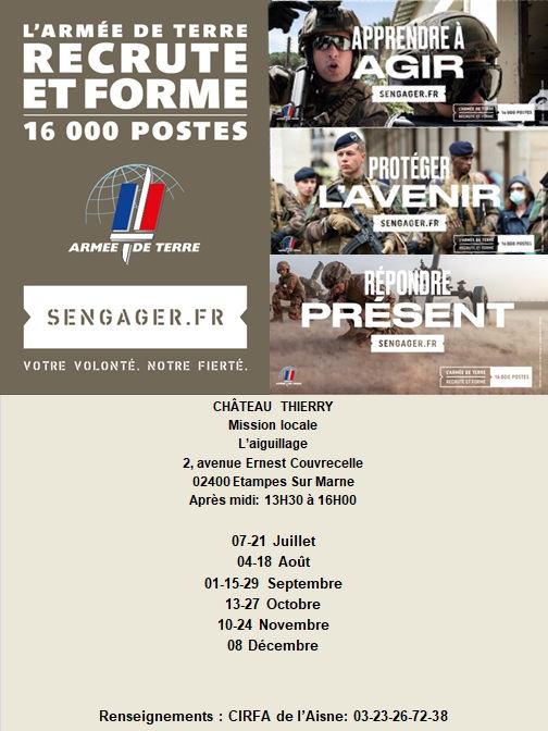 Pour plus de renseignements, vous pouvez contacter le CIRFA de l'Aisne au 03.23.26.72.38.