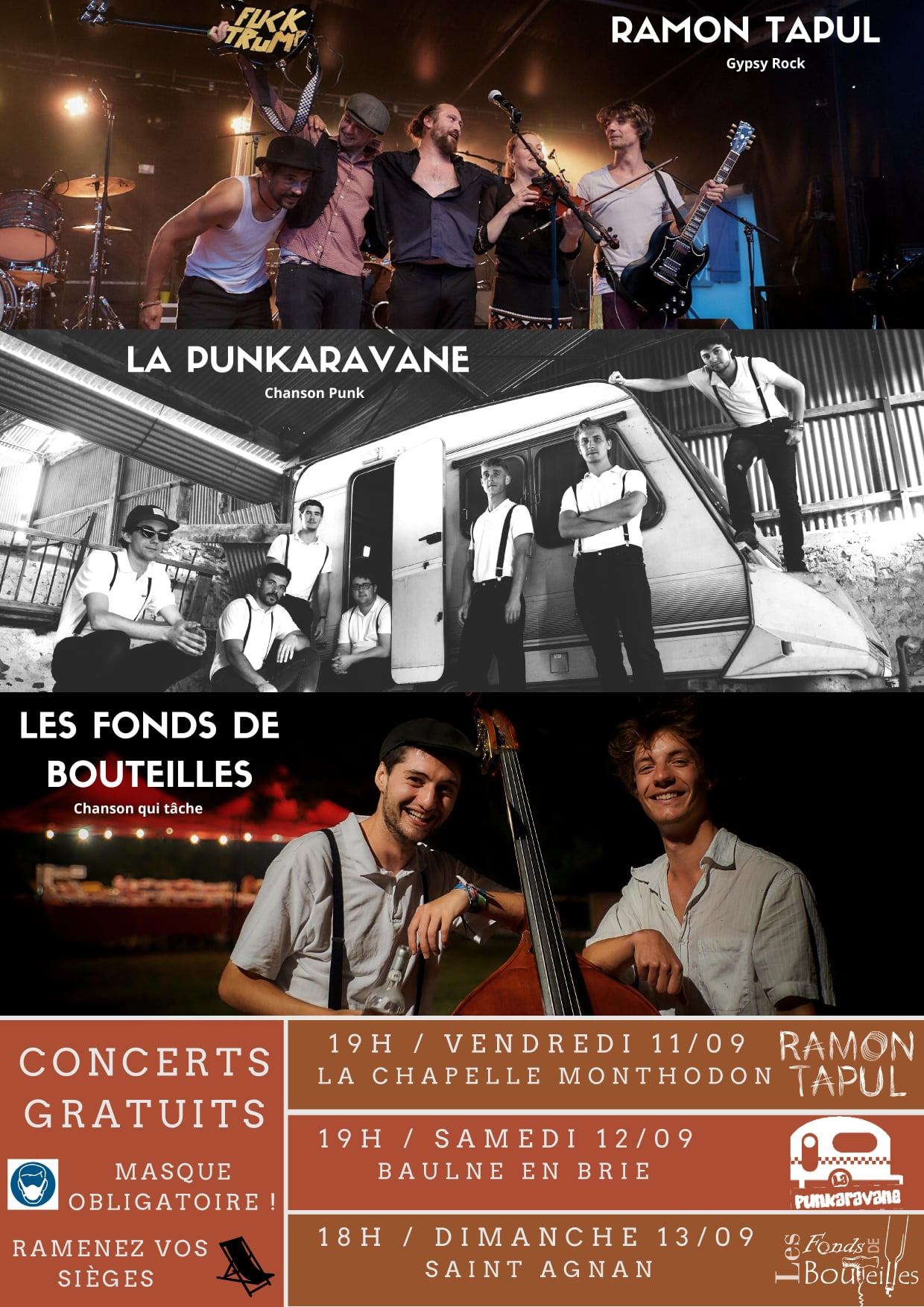 Cette fois, il sort l'artillerie lourde... 3 styles de musiques = 3 concerts gratuits du 11 au 13 septembre 2020 sur les "Place de l'église" de La Chapelle Monthodon, Baulne-en-Brie et Saint-Agnan.
